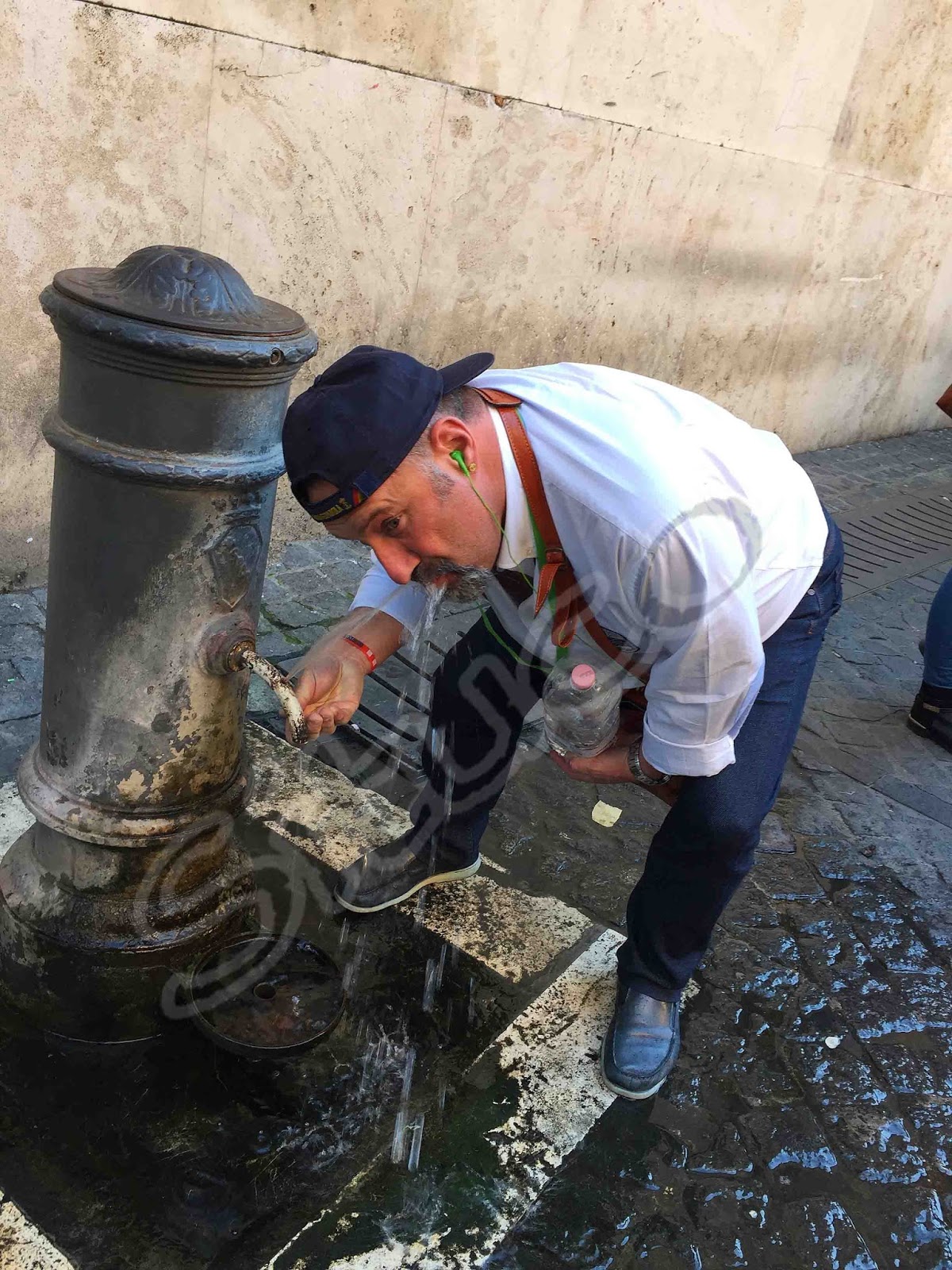 Continuamos la visita a Roma y la guía nos descubrió otra curiosidad, las fuentes romanas, FUENTES NASONAS (de nariz)…, un tipo de fuente con el caño hacia abajo … no parece que tenga nada particular, para llenar las botellas va estupenda pero para beber queda muy baja…, pues gracias a un agujerito que tiene "en la curva del caño" y tapando el agujero inferior puedes beber mas cómodamente tal como se ve en la foto… no conocía el sistema pero está muy bien pensado. Gracias a conocer este sistema pude saciar la sed que los días de calor que pasamos me hicieron tener. (La cerveza es buena, pero a mi lo que me quita la sed es el agua, raro que es uno).